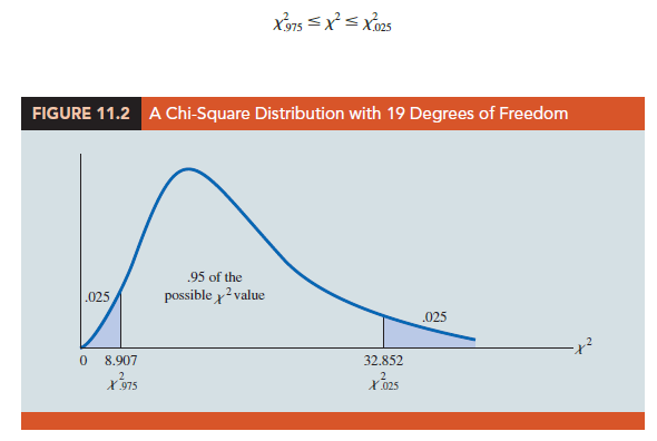 From the graph in Figure 11.2 we see that .95, or 95%, of the chi-square values are between x2975 and x2025. That is, there is a .95 probability of obtaining a X2 value such that