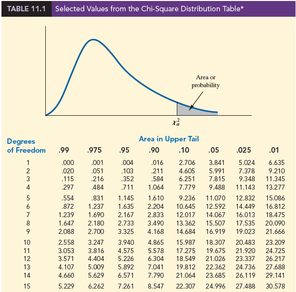 We will use the notation x2a to denote the value for the chi-square distribution that provides an area or probability of a to the right of the x2a value. For example, in Figure 11.2 the chi-square distribution with 19 degrees of freedom is shown with X025 = 32.852 indicating that 2.5% of the chi-square values are to the right of 32.852, and X2975 = 8.907 indicating that 97.5% of the chi-square values are to the right of 8.907. Tables of areas or probabilities are readily available for the chi-square distribution. Refer to Table 11.1 and verify that these chi-square values with 19 degrees of freedom (19th row of the table) are correct. Table 3 of Appendix B provides a more extensive table of chi-square values.