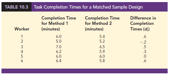 Let us demonstrate the analysis of a matched sample design by assuming it is the method used to test the difference between population means for the two production methods. A random sample of six workers is used. The data on completion times for the six workers are given in Table 10.3. Note that each worker provides a pair of data values, one for each production method. Also note that the last column contains the difference in completion times dt for each worker in the sample.