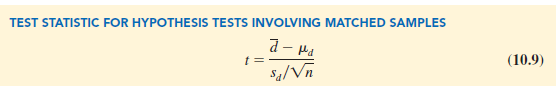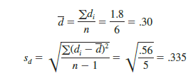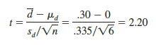Let us use equation (10.9) to test the hypotheses H0: md = 0 and Ha: md Þ 0, using a = .05. Substituting the sample results d = .30, sd = .335, and n = 6 into equation (10.9), we compute the value of the test statistic.