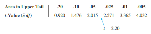 Now let us compute the p-value for this two-tailed test. Because t = 2.20 > 0, the test statistic is in the upper tail of the t distribution. With t = 2.20, the area in the upper tail to the right of the test statistic can be found by using the t distribution table with degrees of freedom = n — 1 = 6 — 1 = 5. Information from the 5 degrees of freedom row of the t distribution table is as follows: