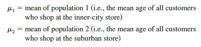 Let us define population 1 as all customers who shop at the inner-city store and population 2 as all customers who shop at the suburban store.