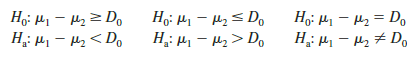 Let us consider hypothesis tests about the difference between two population means. Using D0 to denote the hypothesized difference between μ1 and μ2, the three forms for a hypothesis test are as follows: