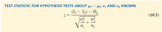 The general steps for conducting hypothesis tests are still applicable here. We must choose a level of significance, compute the value of the test statistic, and find the p-value to determine whether the null hypothesis should be rejected. With two independent simple random samples, we showed that the point estimator X1 – X2 has a standard error sXi 2– given by expression (10.2) and, when the sample sizes are large enough, the distribution of X1 – X2 can be described by a normal distribution. In this case, the test statistic for the difference between two population means when σ1 and σ2 are known is as follows.