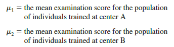 As part of a study to evaluate differences in education quality between two training centers, a standardized examination is given to individuals who are trained at the centers. The difference between the mean examination scores is used to assess quality differences between the centers. The population means for the two centers are as follows.