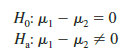 We begin with the tentative assumption that no difference exists between the training quality provided at the two centers. Hence, in terms of the mean examination scores, the null hypothesis is that μi – μ2 = 0. If sample evidence leads to the rejection of this hypothesis, we will conclude that the mean examination scores differ for the two populations. This conclusion indicates a quality differential between the two centers and suggests that a follow-up study investigating the reason for the differential may be warranted. The null and alternative hypotheses for this two-tailed test are written as follows.