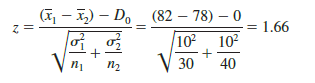 Independent simple random samples of n1 = 30 individuals from training center A and n2 = 40 individuals from training center B are taken. The respective sample means are x1 = 82 and x2 = 78. Do these data suggest a significant difference between the population means at the two training centers? To help answer this question, we compute the test statistic using equation (10.5).