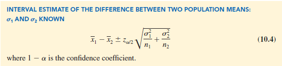 In this section, we assume that information is available such that the two population standard deviations, σ1 and σ2, can be assumed known prior to collecting the samples. We refer to this situation as the σ1 and σ2 known case. In the following example we show how to compute a margin of error and develop an interval estimate of the difference between the two population means when σ1 and σ2 are known.