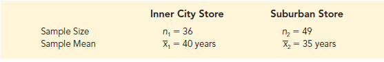 Greystone Department Stores, Inc., operates two stores in Buffalo, New York: One is in the inner city and the other is in a suburban shopping center. The regional manager noticed that products that sell well in one store do not always sell well in the other. The manager believes this situation may be attributable to differences in customer demographics at the two locations. Customers may differ in age, education, income, and so on. Suppose the manager asks us to investigate the difference between the mean ages of the customers who shop at the two stores.