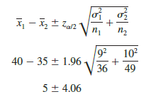 Using expression (10.1), we find that the point estimate of the difference between the mean ages of the two populations is X1 – X2 = 40 – 35 = 5 years. Thus, we estimate that the customers at the inner-city store have a mean age five years greater than the mean age of the suburban store customers. We can now use expression (10.4) to compute the margin of error and provide the interval estimate of Thus the interval estimate of the difference between two population means is as follows: μ1 – μ2. Using 95% confidence and za/2 = z.025 = 1.96, we have