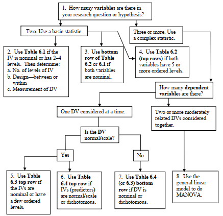 - Decide how many variables there are in your research question or hypothesis. If there are only two variables, use Table 6.1 or 6.2. If there is more than one independent and/or dependent variable (i.e., three or more variables) to be used in this analysis, use Table 6.3 or 6.4.