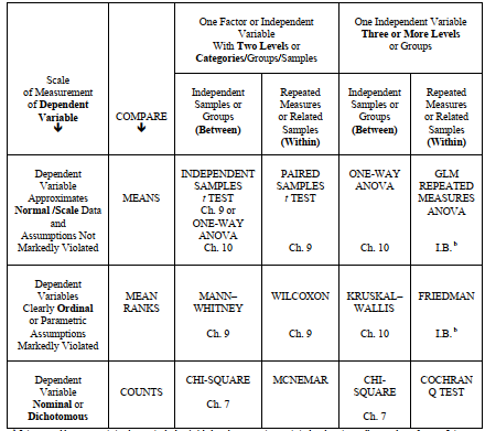 Table 6.1. Selection of an Appropriate Inferential Statistic for Basic, Two Variable, Difference Questions or Hypothesesa