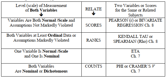 Table 6.2. Selection of an Appropriate Inferential Statistic for Basic, Two Variable, Associational Questions or Hypotheses