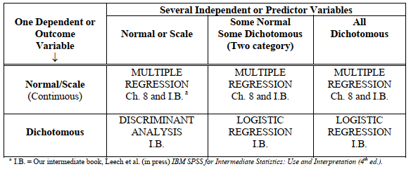 - If the dependent variable is dichotomous or nominal, consult the bottom row of Table 6.4, and use discriminant analysis or logistic regression, both discussed in Leech et al. (2005).