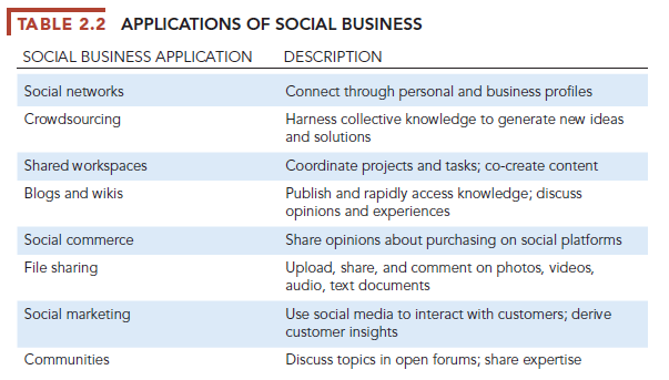 Table 2.2 describes important applications of social business inside and outside the firm. This chapter focuses on enterprise social business—its internal corporate uses.