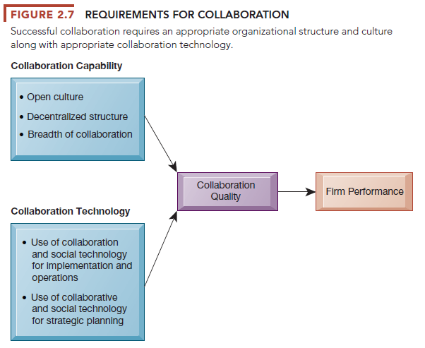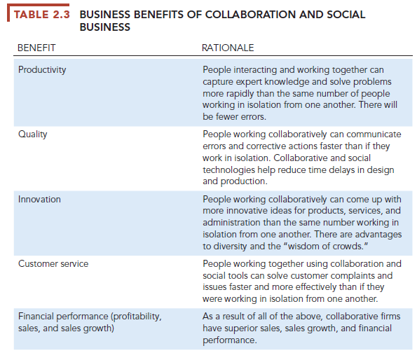 Table 2.3 summarizes some of the benefits of collaboration and social business that have been identified. Figure 2.7 graphically illustrates how collaboration is believed to affect business performance.