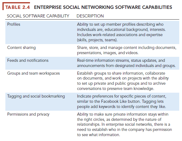 Enterprise Social Networking Tbols The tools we have just described include capabilities for supporting social business, but there are also more specialized social tools for this purpose, such as Salesforce Chatter, Microsoft Yammer, Jive, Face- book Workplace, and IBM Connections. Enterprise social networking tools create business value by connecting the members of an organization through profiles, updates, and notifications similar to Facebook features but tailored to internal corporate uses. Table 2.4 provides more detail about these internal social capabilities.