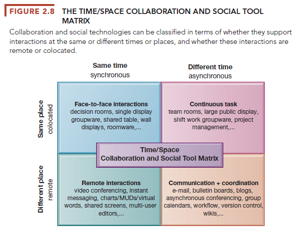 The collaboration and social technologies we have just described are ways of overcoming the limitations of time and space. Using this time/space framework will help you to choose the most appropriate collaboration and teamwork tools for your firm. Note that some tools are applicable in more than one time/ place scenario. For example, Internet collaboration suites such as IBM Notes have capabilities for both synchronous (instant messaging, meeting tools) and asynchronous (e-mail, wikis, document editing) interactions.