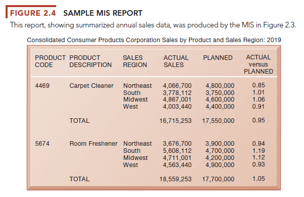 MIS typically provide answers to routine questions that have been specified in advance and have a predefined procedure for answering them. For instance, MIS reports might list the total pounds of lettuce used this quarter by a fast- food chain or, as illustrated in Figure 2.4, compare total annual sales figures for specific products to planned targets. These systems generally are not flexible and have little analytical capability. Most MIS use simple routines, such as summaries and comparisons, as opposed to sophisticated mathematical models or statistical techniques.