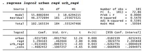 . regress logco2 c.urban i.reg4 c.urban#i.reg4