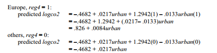 We form an interaction term or slope dummy variable named urb_reg4 by multiplying the dummy variable reg4 times the measurement variable urban. The resulting variable urb_reg4 equals urban for countries in Europe, and zero for all other countries.