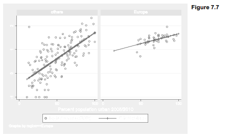 The post-regression command predict newvar generates a new variable holding predicted values from the recent regression. Graphing the predicted values for this example visualizes our interaction effect (Figure 7.7). The line in the left-hand (reg4 = 0) panel has a slope of .0217 and y-intercept -.4682. The line in the right panel (reg4 = 1) has a less-steep slope (.0084) and a higher y-intercept (.826). No European countries exhibit the low-urbanization, low-CO2 profile seen in other parts of the world; and even European nations with middling urbanization have relatively high CO2 emissions.