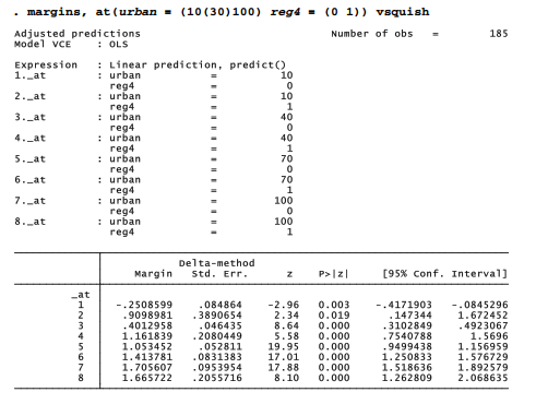 margins understands # or ## interactions. Percent urban ranges from about 10 to 100 percent in these data, so we could graph the interaction as follows. First calculate the predicted means of logco2 at several combinations of urban (10, 40, 70 or 100) and reg4 (0 or 1).