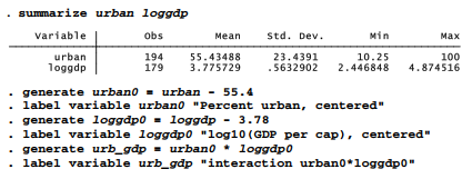 Interaction effects could also involve two measurement variables. A trick called centering helps to reduce multicollinearity problems with such interactions, and makes their main effects easier to interpret. Centering involves subtracting their respective means from both variables before defining an interaction term as their product. Centered variables have means approximately equal to zero, and are negative for below-average values. The commands below calculate centered versions of urban and loggdp, named urbanO and loggdpO. The interaction term urb_gdp is then defined as the product of urbanO times loggdpO.