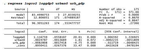 Regressing logco2 on the centered main effects loggdpO and urbanO, along with the interaction term urb_gdp, we find that the interaction effect is negative and statistically significant.