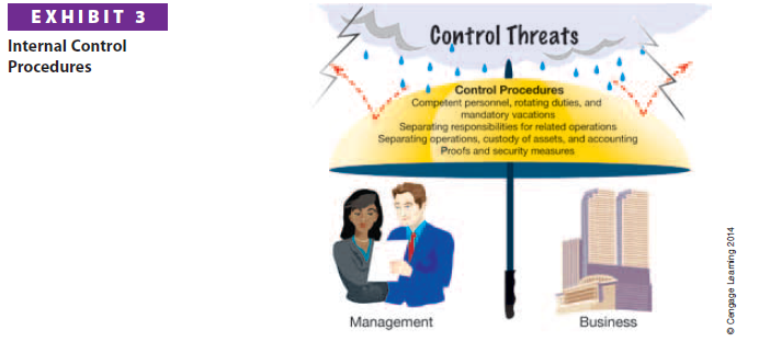 In Exhibit 2, the elements of internal control form an umbrella over the business to protect it from control threats. The control environment is the size of the umbrella. Risk assessment, control procedures, and monitoring are the fabric of the umbrella, which keep it from leaking. Information and communication connect the umbrella to management.