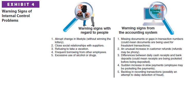 Monitoring the internal control system is used to locate weaknesses and improve controls. Monitoring often includes observing employee behavior and the accounting system for indicators of control problems. Some such indicators are shown in Exhibit 4.