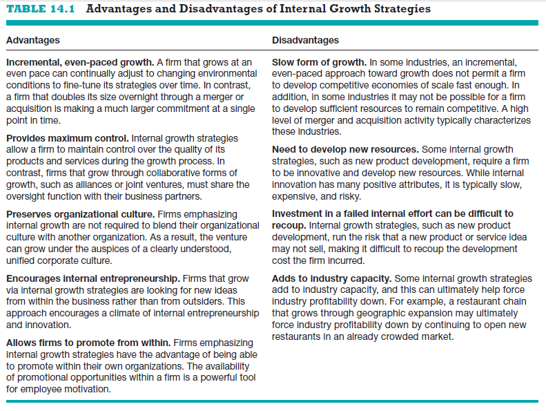 We list the distinct advantages and disadvantages of internal growth strat- egies in Table 14.1.