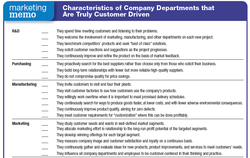Internal marketing requires that everyone in the organization accept the concepts and goals of marketing and engage in identifying, providing, and communicating customer value. Only when all employees realize their job is to create, serve, and satisfy customers does the company become an effective marketer.7 “Marketing Memo: Characteristics of Company Departments That Are Truly Customer Driven” presents a tool that evaluates which company departments excel at being customer-centric.