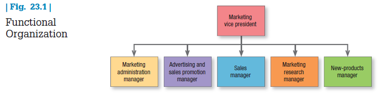 FUNCTIONAL ORGANIZATION In the most common form of marketing organization, functional specialists report to a marketing vice president who coordinates their activities. Figure 23.1 shows five specialists. Others might include a customer service manager, a marketing planning manager, a market logistics manager, a direct marketing manager, and a digital marketing manager.