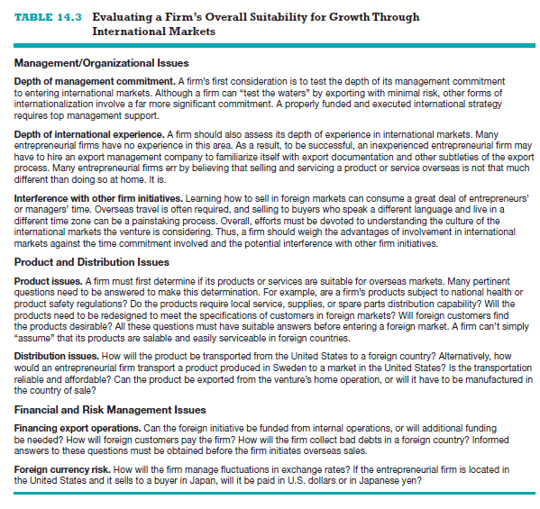 Table 14.3 provides a review of the issues that should be considered, includ- ing management/organizational issues, product and distribution issues, and financial and risk management issues, when a venture considers expanding into international markets. If these issues can be addressed successfully, growth through international markets may be an excellent choice for an en- trepreneurial firm. The major impediment in this area is not fully appreciating the challenges involved.