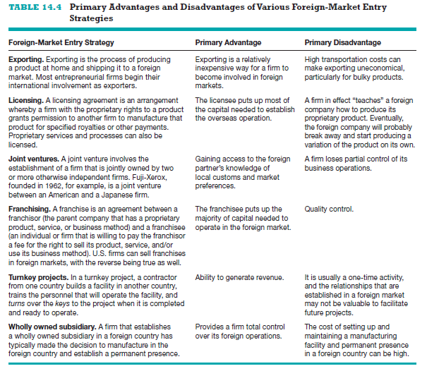 The majority of entrepreneurial firms first enter foreign markets as exporters, but firms also use licensing, joint ventures, franchising, turnkey projects, and wholly owned subsidiaries to start international expansion.13 These strategies, along with their primary advantages and disadvantages, are explained in Table 14.4.