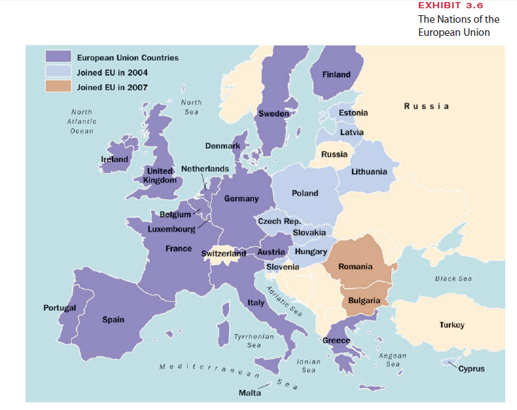 25-nation alliance illustrated in Exhibit 3.6. The biggest expansion came in 2004, when the EU welcomed 10 new members from southern and eastern Europe: Cyprus, the Czech Republic, Estonia, Hungary, Latvia, Lithuania, Malta, Poland, Slovakia, and Slovenia. In addition, Bulgaria, Romania, and Turkey have opened membership negotiations. A treaty signed in early 2003 formalized new rules and policies to ensure that the EU can continue to function efficiently with 25 or more members.47