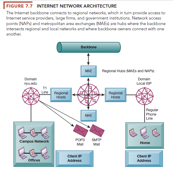 Internet data traffic is carried over transcontinental high-speed backbone networks that generally operate in the range of 155 Mbps to 2.5 Gbps (see Figure 7.7). These trunk lines are typically owned by long-distance telephone companies (called network service providers) or by national governments. Local connection lines are owned by regional telephone and cable television companies in the United States and in other countries that connect retail users in homes and businesses to the Internet. The regional networks lease access to ISPs, private companies, and government institutions.