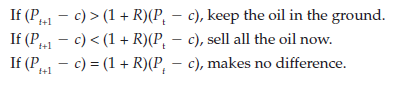 How fast must the price rise for you to keep the oil in the ground? The value of each barrel of oil in your well is equal to the price of oil less the $10 cost of extracting it. (This is the profit you can obtain by extracting and selling each barrel.) This value must rise at least as fast as the rate of interest for you to keep the oil. Your production decision rule is therefore: Keep all your oil if you expect its price less its extraction cost to rise faster than the rate of interest. Extract and sell all of it if you expect price less cost to rise at less than the rate of interest. What if you expect price less cost to rise at exactly the rate of interest? Then you would be indifferent between extracting the oil and leaving it in the ground. Letting Pt be the price of oil this year, Pt+1 the price next year, and c the cost of extraction, we can write this production rule as follows: