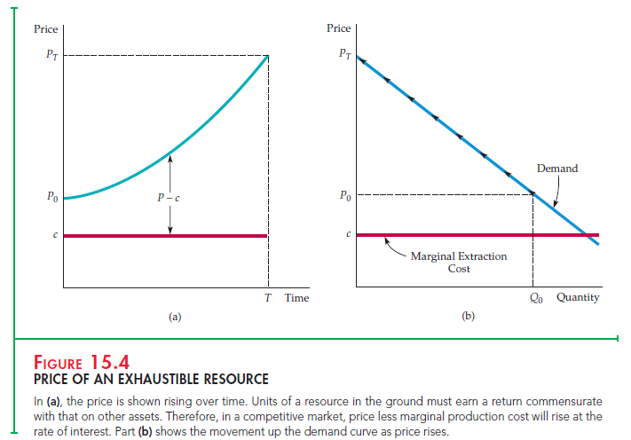 Figure 15.4 illustrates how the market price must rise. The marginal cost of extraction is c, and the price and total quantity produced are initially P0 and Q0. Part (a) shows the net price, P – c, rising at the rate of interest. Part (b) shows that as price rises, the quantity demanded falls. This continues until time T, when all the oil has been used up and the price PT is such that demand is just zero.