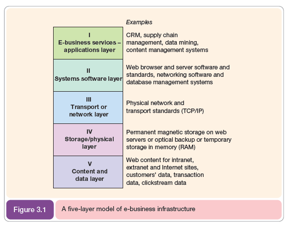 application to their manager and human resources department for approval. To access the application, the employee will use a web browser such as Microsoft Internet Explorer, Mozilla Firefox or Google Chrome using an operating system such as Microsoft Windows XP or Apple OS X (Level II in Figure 3.1). This systems software will then request transfer of the information about the holiday request across a network or transport layer (Level III in Figure 3.1). The information will then be stored in computer memory (RAM) or in longterm magnetic storage on a web server (Level IV in Figure 3.1). The information itself which makes up the web pages or content viewed by the employee and the data about their holiday request are shown as a separate layer (Level V in Figure 3.1), although it could be argued that this is the first or second level in an e-business architecture.