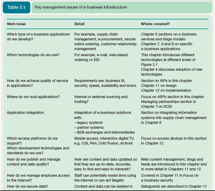 We return to some issues of e-business infrastructure management later in this book. Table 3.1 provides a summary of the main issues facing businesses and where they are covered in this chapter and later in the book.