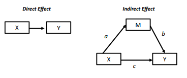 Let’s look at a simple mediation model to give some context to our discussion.We have an independent variable (we will label it “X”) that has a proposed direct influence on a depend- ent variable (we will call it “Y”). We will also propose that the influence of X to Y might flow through a mediator variable (we will call it “M”).We have three variables in this simple model. We are going to examine the direct effect of X toY and also the indirect effect of X to M toY. The indirect effect is calculated by taking the product of the X to M relationship and the M to Y relationship. We will simply multiply the regression coefficients for each of those relation- ships to get the indirect effect.