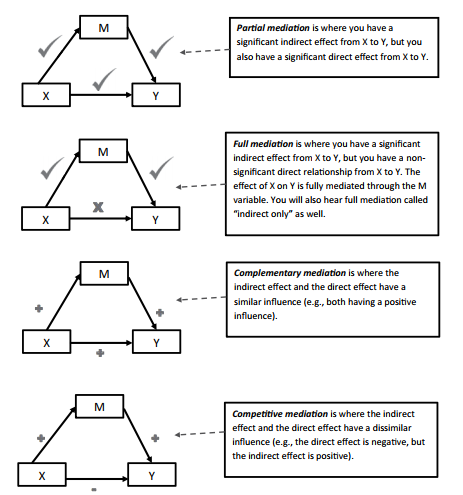 Mediation can take numerous forms in a model. You can have what is called full media- tion (also called indirect only mediation) where the direct effect between two constructs is non-significant, but an indirect effect through a mediator does have a significant relationship. Partial mediation is another form that mediation can take. This is where the direct effect between two constructs is significant, and so is the indirect effect through a mediator. Lastly, you can have complementary and competitive mediation. Complementary mediation is where the direct effect and the indirect effect have a similar influence in regard to directionality. For instance, the direct effect may a have positive influence, and the indirect effect has a positive influence as well. A competitive mediation is where you have different directionality between the direct effect and indirect effect. The direct effect might have a negative influence, but the indirect effect might have a positive influence.With this type of mediation, the presence of the mediator can change the directionality of the influence.