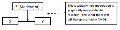 There are numerous ways to test for moderation using SEM. The first method I will discuss is the “interaction term” method. An interaction term is where you form a product term of the independent variable and the moderator. This interaction term will then let you know if the presence of the moderator is significantly influencing the relationship from the independent vari- able to the dependent variable. If your moderator is a continuous variable, the interaction term method is the preferred option in moderation testing. Before moving on to an example, we need to address the potential graphing discrepancy with moderation. For many researchers trying to represent moderation graphically in a publication, they will simply draw a line from the mod- erator that intersects the influence from the independent to the dependent variable.You cannot graphically draw a moderator like this in AMOS. It will not simply let you draw a moderator arrow that is intercepting a direct effect between two variables. I just wanted to clarify this point that AMOS will not reproduce moderation the same way it is often graphically represented.