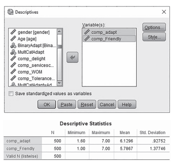 In testing for moderation, we need to mean center the independent variable and the moderator before we form the product term. To mean center the data, we first need to get the mean for the independent variable and moderator. In SPSS, go to the “Analyze” option on the top menu, then go to “Descriptive Statis- tics” and then “Descrip- tives”. This will bring up a descriptives pop-up win- dow. Since this is a path model, we are concerned only with the composite variables of the independ- ent variable and modera- tor. In the Descriptives window, you need to select your independent variable (comp_adapt) and moderator (comp_ Friendly) and hit “OK”. This will give us the mean value for each composite variable. Adaptive Behav- ior was 6.12 and Friend-liness was 5.78 (on a 1–7 Likert Scale).