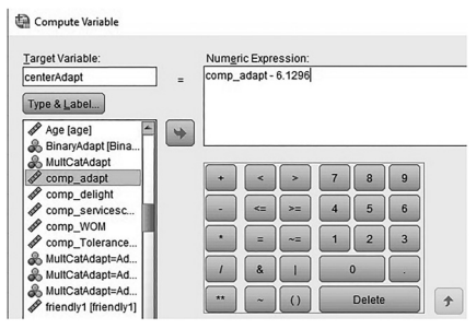 To assess this interaction, we need to form a product term of Adaptive Behavior and Friend- liness. A problem that can occur with a product term is the issue of high collinearity with the original constructs which can cause problems in the analysis (Frazier et al. 2004). One way to circumnavigate this problem is to mean center the variables in your data. There has been an ongoing debate on whether mean centering is necessary. Previous research has stated the results are essentially the same whether you mean center or leave the data in its raw form (Echambadi and Hess 2007; Hayes 2018). While the differences between these methods are minimal, the advantage of mean centering the data is not only are you accounting for potential collinearity issues, but it also makes the interpretation of results easier.Thus, the recommen- dation to mean center your data before analyzing the data is encouraged (Dawson 2014).