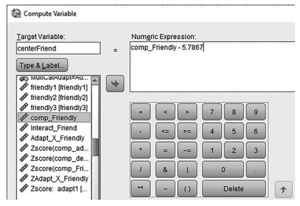 Once we have the mean values, we need to form a new variable that is mean centered. In SPSS, go to the “Transform” menu option and “Compute Variable”.This function will allow us to create a new variable that is going to mean center the original variable. For Adaptive Behav- ior, let’s call the new variable “centerAdapt” and in the numeric expression we will subtract the mean from the original variable of “comp_Adapt” (composite variable of Adaptive Behav- ior). Let’s do the same thing with the moderator.We will call that variable “centerFriend”.The new variables will be listed in the last columns of the SPSS data file.