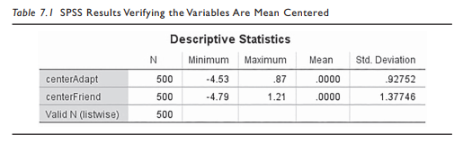 If you are concerned that the new variable is mean centered correctly, you can do a simple test in SPSS to verify your results. In SPSS, go to the “Analyze” menu option, “Descriptive Sta- tistics”, and then “Descriptives”.The pop-up window will appear, and this time you will select the recently formed mean centered variables of centerAdapt and then centerFriend. Hit the OK button and run the analysis.You can see that the mean for those variables is listed as a zero. The standard deviation is the exact same for the mean centered and original variables.You will also notice that the minimum and maximum values have changed from the original variables. The subtraction of the mean from all the variables has altered these values now. Again, if you are curious if a variable was actually mean centered, here is a quick way to tell.