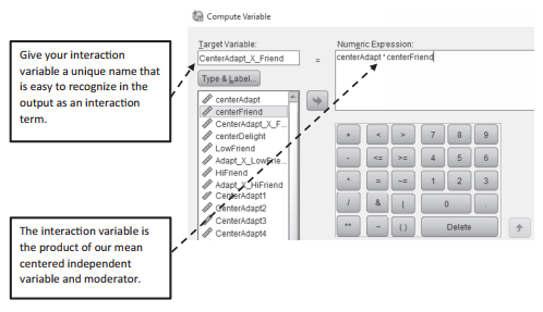 Once we have created the new centered variables, we need to create a product term (inter- action) variable. Let’s go back to the “Compute Variable” function in SPSS. Now we are going to multiply the two centered variables of “centerAdapt” and “centerFriend”. This will create an interaction term that we are going to need to assess moderation. Let’s call the interaction variable “CenterAdapt_X_Friend”. Once we have formed the mean centered variables and the interaction variable, we are ready to save the data and then go to AMOS to draw our modera- tion model in the graphics window.